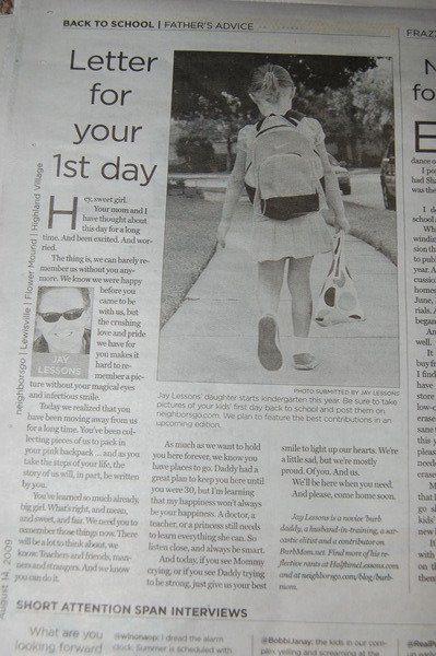 oh my…how sweet! what a lucky girl to have you as daddy. i love her picture walking away…so cute! i just sent one to high school and one to kindergarten this year…still 2 to go.